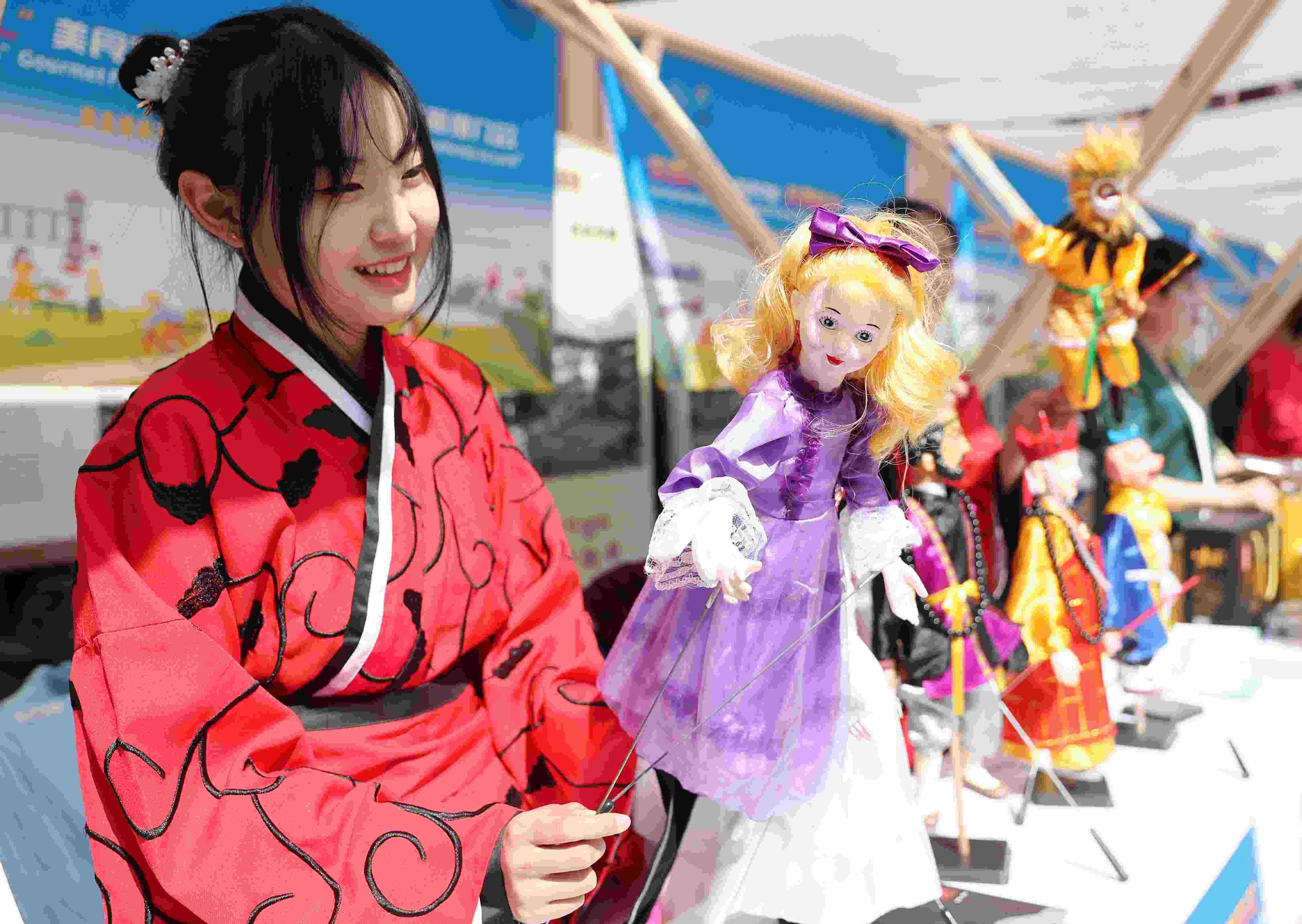 4月30日,山東萊西木偶藝術團的演員在給游人們展示木偶戲的表演技巧。 張進剛 攝