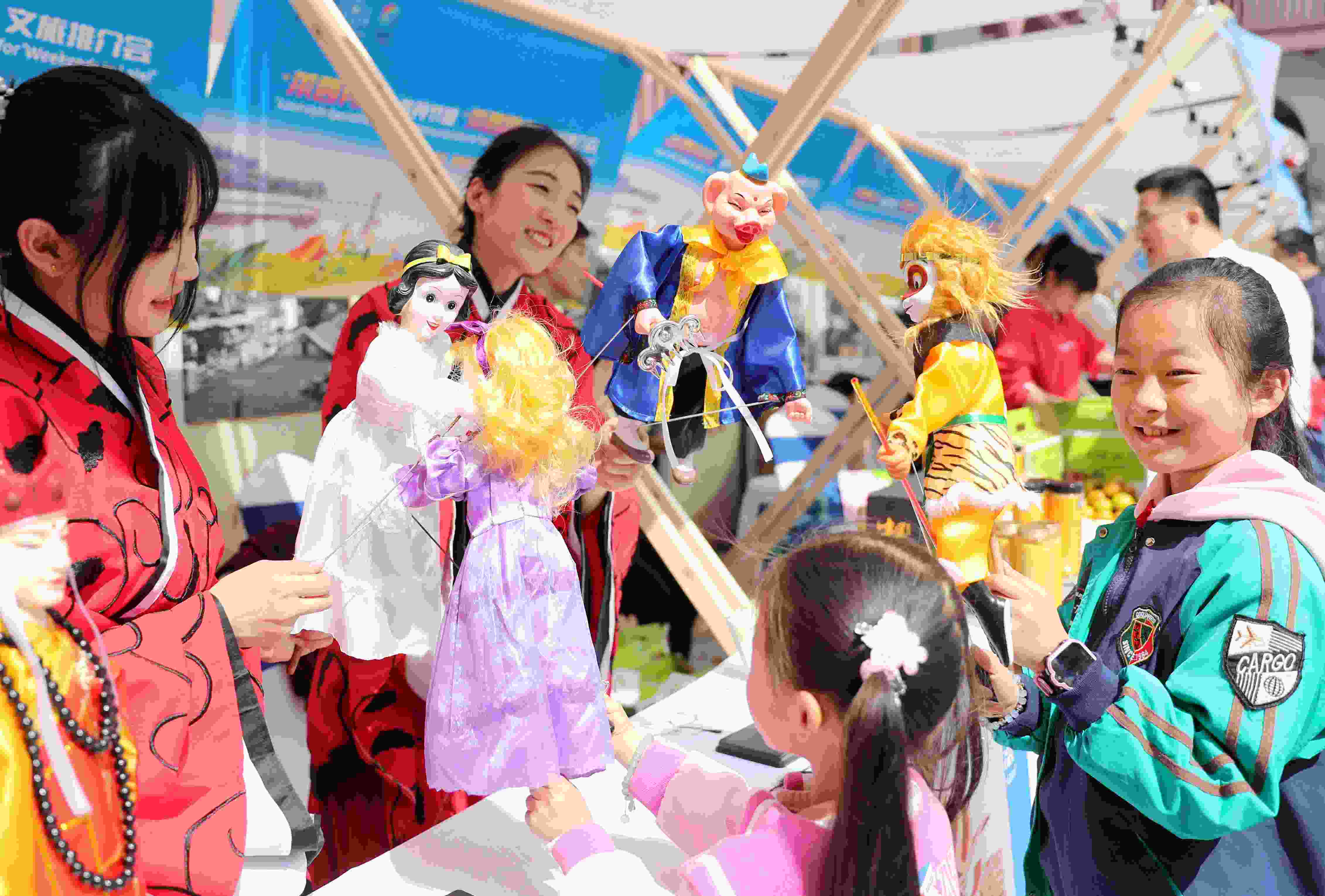 4月30日,山東萊西木偶藝術團的演員在給小朋友們展示木偶戲的表演技巧。 張進剛 攝