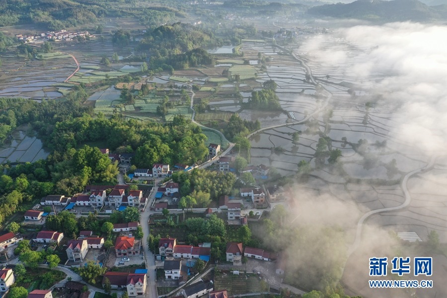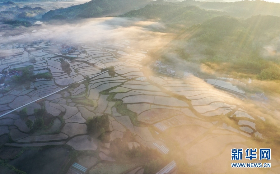 春日清晨,航拍安徽省宣城市旌德縣興隆鎮(zhèn)三山村,線條優(yōu)美的梯田、若隱若現(xiàn)的村莊、濃淡相宜的云霧、變幻莫測(cè)的朝霞,描繪出一幅幅美麗的鄉(xiāng)村畫(huà)卷。