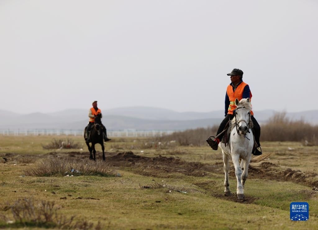 5月2日,河北省承德市豐寧滿族自治縣大灘鎮(zhèn)扎拉營村的護(hù)林員趙世海(右)和羅金寶在海留圖國家濕地公園修復(fù)護(hù)欄。