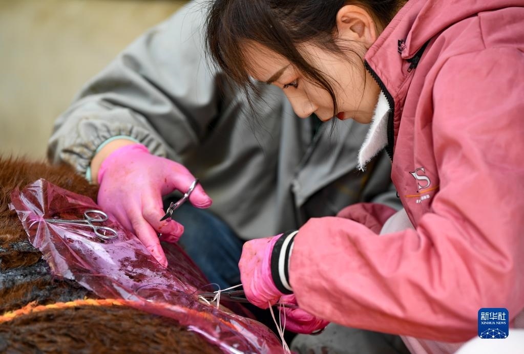 白婳在固原市原州區(qū)開城鎮(zhèn)雙泉村為村民李百武的一頭牛縫合傷口(4月18日攝)。