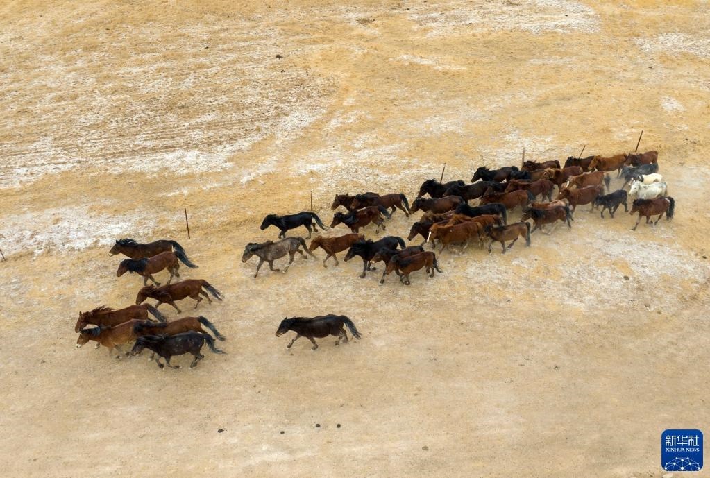5月3日,在阿克塞縣阿伊納鄉(xiāng)海子草原,牧民趕著馬群進行轉(zhuǎn)場(無人機照片)。   新華社發(fā)(高宏善 攝)