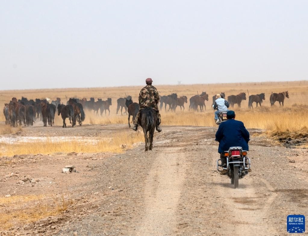5月3日,在阿克塞縣阿伊納鄉(xiāng)海子草原,牧民趕著馬群進行轉(zhuǎn)場。   新華社發(fā)(高宏善 攝)