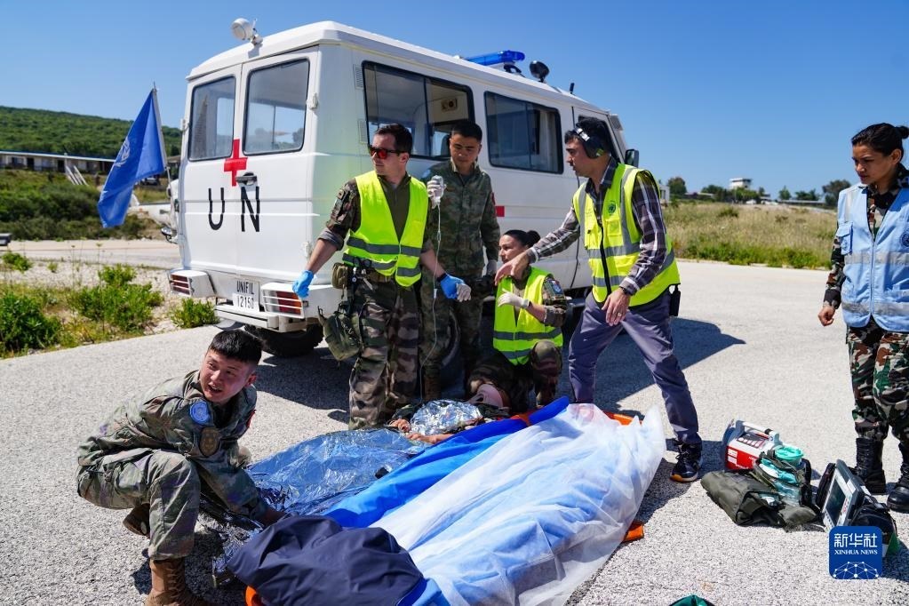 5月3日,在黎巴嫩南部邊境“藍線”附近雷場,參與演習的中國第21批赴黎巴嫩維和多功能工兵分隊醫(yī)療組對“傷員”傷情進行前期處置。
