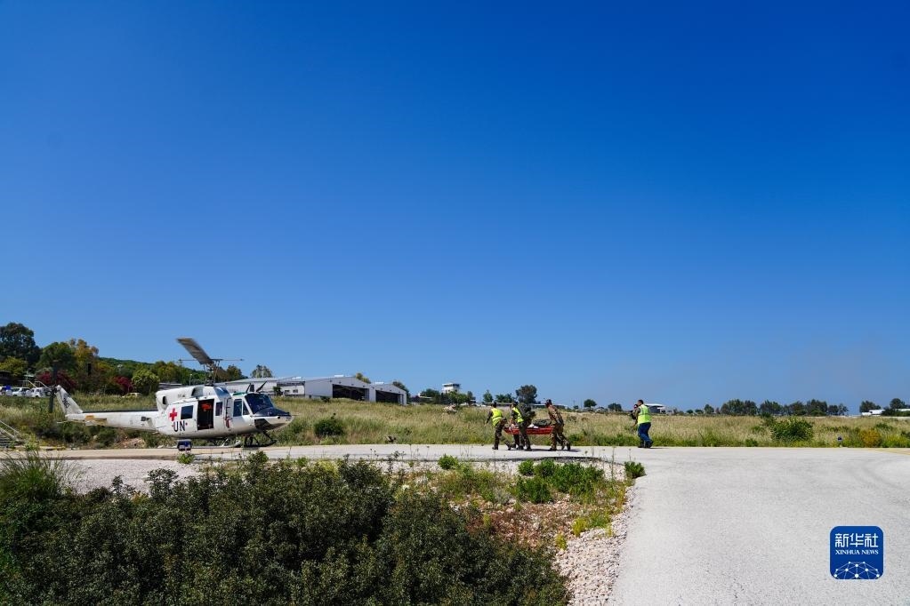 5月3日,在黎巴嫩南部邊境“藍線”附近雷場,參與演習的中國第21批赴黎巴嫩維和多功能工兵分隊隊員使用救援直升機轉(zhuǎn)運“傷員”。