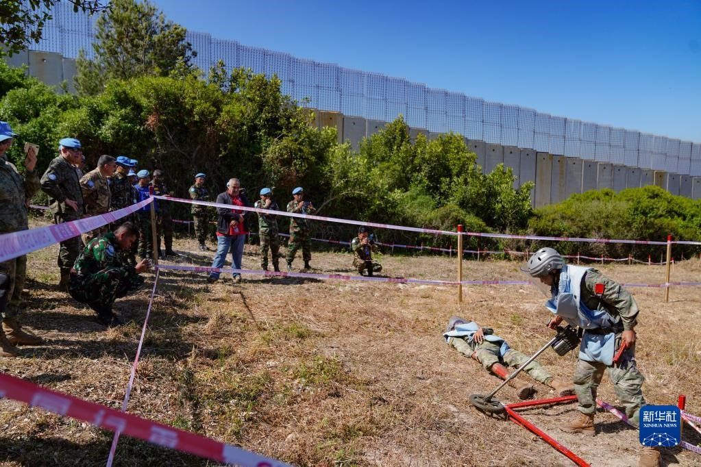 5月3日,在黎巴嫩南部邊境“藍線”附近雷場,參與演習的中國第21批赴黎巴嫩維和多功能工兵分隊掃雷作業(yè)手開辟救援通道。