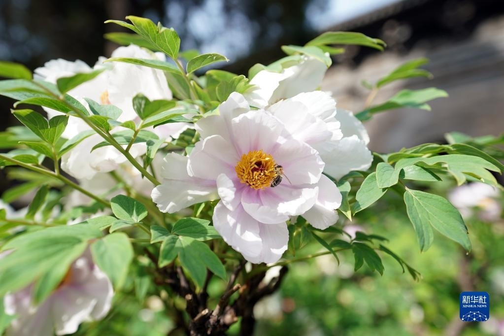 5月8日,在太原雙塔寺景區(qū),蜜蜂在花間采蜜。   新華社記者 詹彥 攝