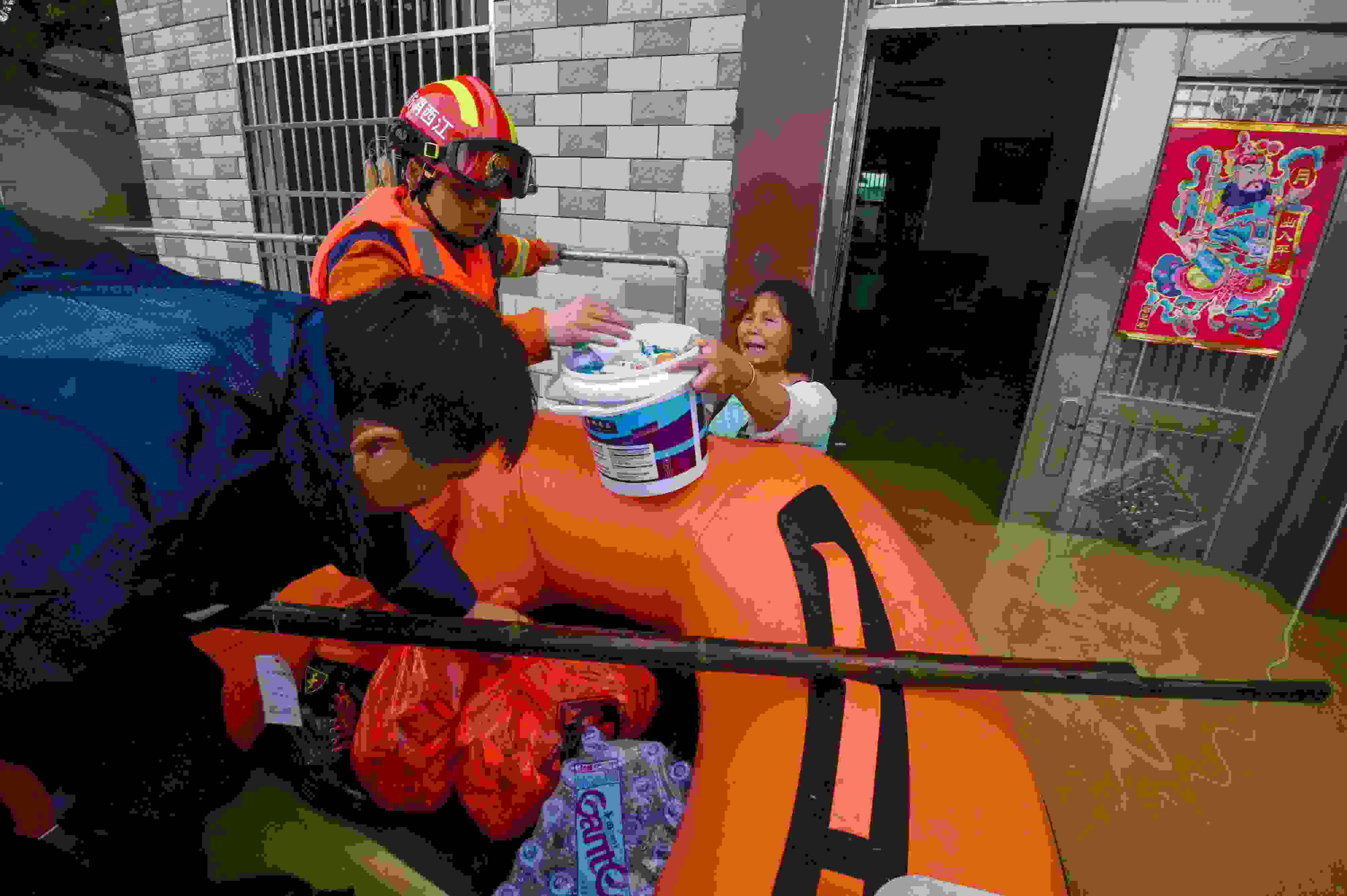 2023年5月6日,江西吉安,新干縣消防救援大隊(duì)隊(duì)員在麥斜鎮(zhèn)拿埠村給受困群眾運(yùn)送生活物資。 視覺中國