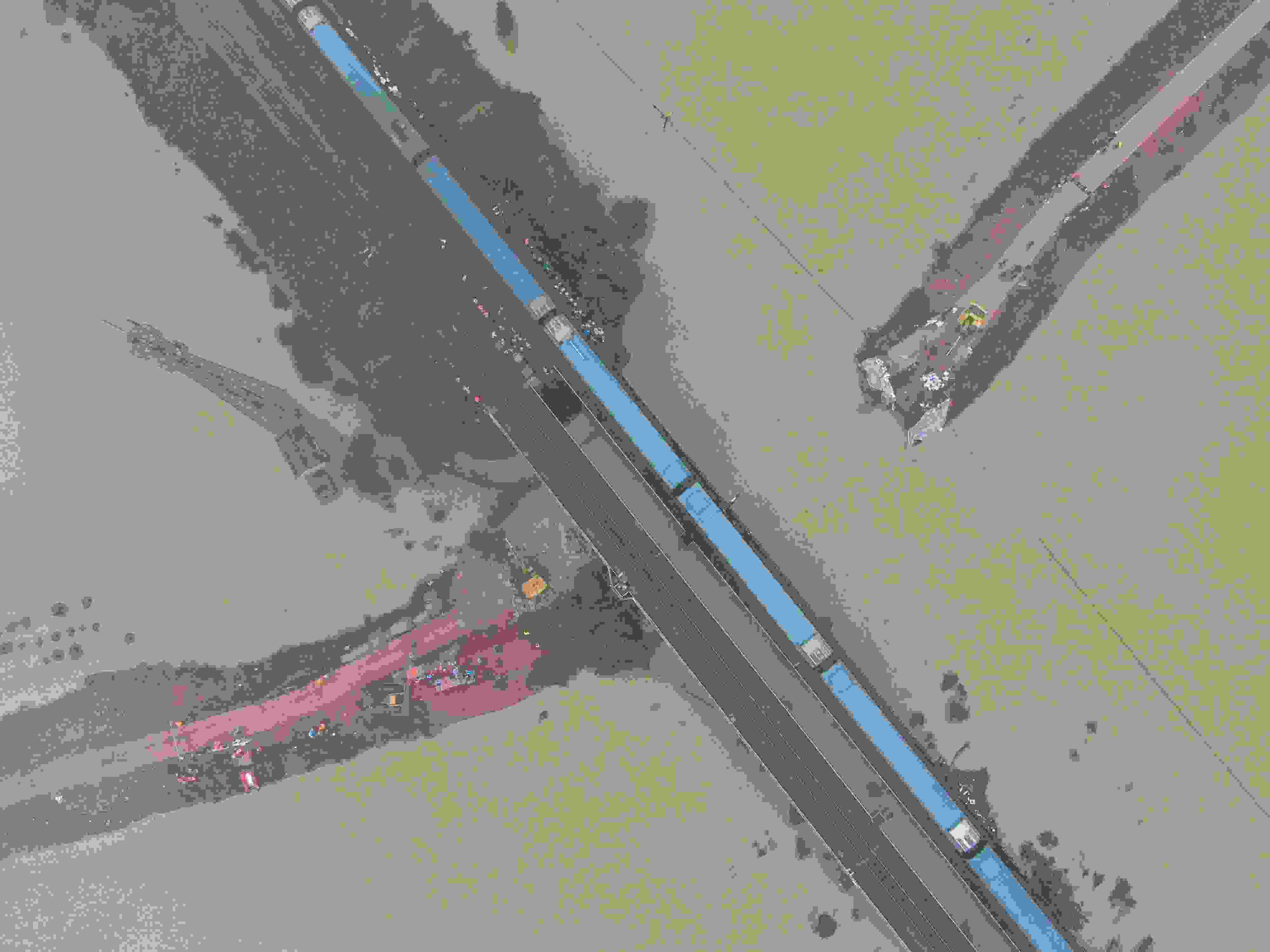2023年5月6日,江西宜春,航拍清豐堤河堤潰口現(xiàn)場(chǎng),一列火車從潰口上方的鐵路橋上經(jīng)過,橋下的救援隊(duì)伍正在開展搶險(xiǎn)救援工作。 視覺中國