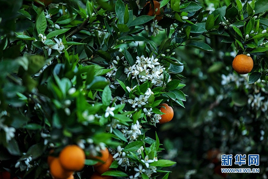 柑橘園里,濃郁的花香隨風(fēng)四溢,金燦燦的柑橘掩映在枝葉中,星星點(diǎn)點(diǎn)的小白花點(diǎn)綴其間,花香和果香交織沁人心脾。新華網(wǎng)發(fā)(余鴻 攝)
