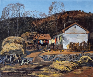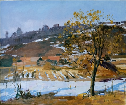 《激戰(zhàn)松骨峰》描繪的是抗美援朝戰(zhàn)爭(zhēng)中,中國(guó)人民志愿軍與美軍激烈廝殺的悲壯場(chǎng)面。作者從動(dòng)態(tài)型的構(gòu)圖與形象表層,把戰(zhàn)爭(zhēng)集團(tuán)之間的搏殺以濃重的筆調(diào)展現(xiàn)開來(lái),表現(xiàn)了中國(guó)人民志愿軍英勇頑強(qiáng)、熱愛(ài)自由和勇于犧牲的精神,展示了歷史的悲劇性沖突。作者從沉甸甸的歷史中找到戰(zhàn)爭(zhēng)中最慘烈、最殘酷、最能表現(xiàn)人物悲劇性命運(yùn)的瞬間,用現(xiàn)實(shí)主義的創(chuàng)作手法,扎實(shí)、生動(dòng)地塑造了一個(gè)又一個(gè)志愿軍勇士的形象。硝煙籠罩著戰(zhàn)場(chǎng),鮮血與白雪融合成冰,敵我雙方,犬牙交錯(cuò),生死搏殺。同時(shí),也使我們感受到戰(zhàn)爭(zhēng)的殘酷與生命的脆弱。作者處理宏大的戰(zhàn)爭(zhēng)場(chǎng)面獨(dú)具匠心:陽(yáng)光透過(guò)硝煙,有節(jié)奏地營(yíng)造出戰(zhàn)場(chǎng)的空間;雪地上被間隔的藍(lán)色陰影,反襯出黃褐色的主調(diào)。作品對(duì)細(xì)部進(jìn)行了恰如其分的刻畫,但又不失對(duì)整體宏觀的把握,厚重的色彩中透出熱情,樸拙的筆觸映著畫家的激動(dòng)。
