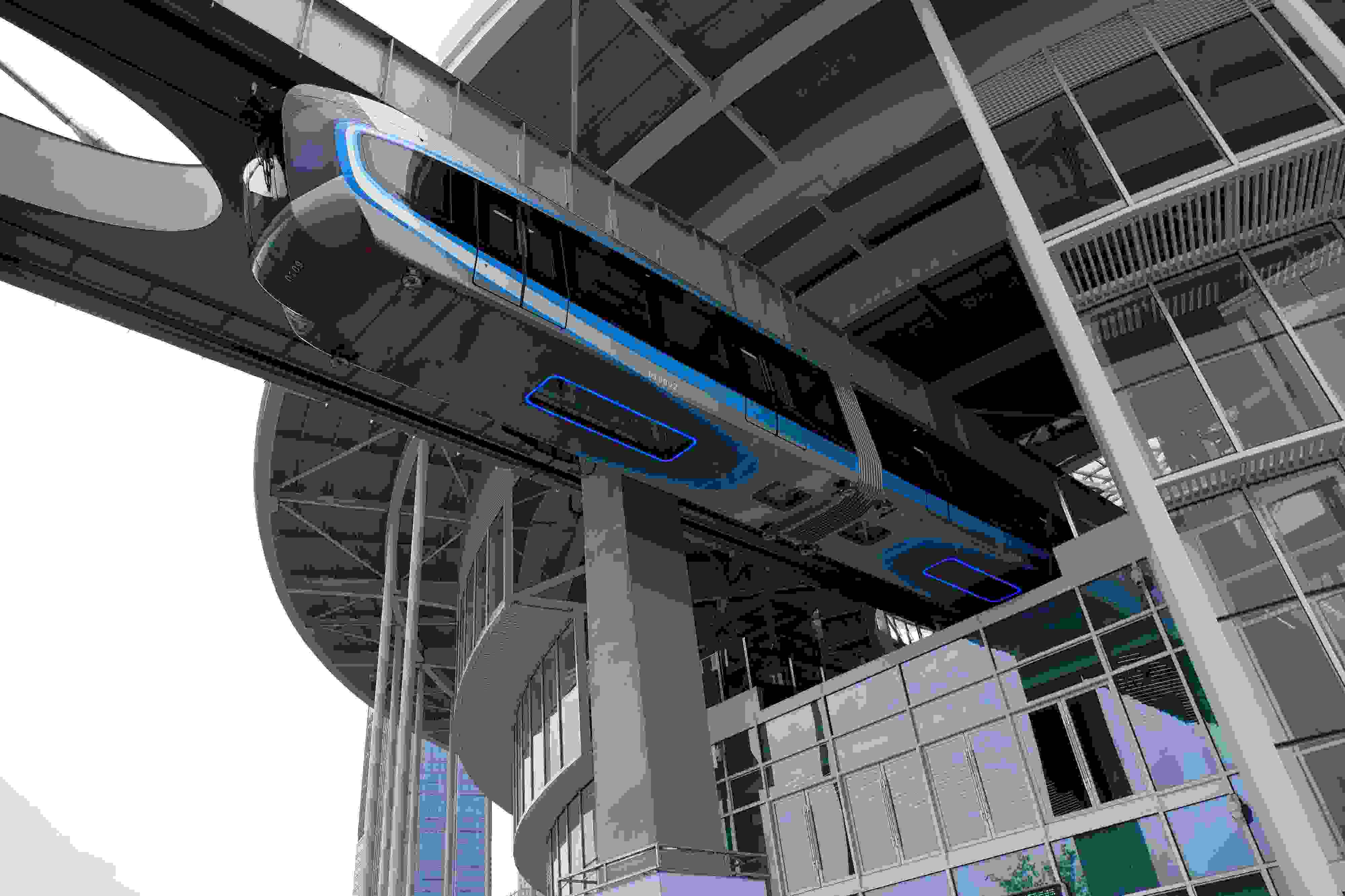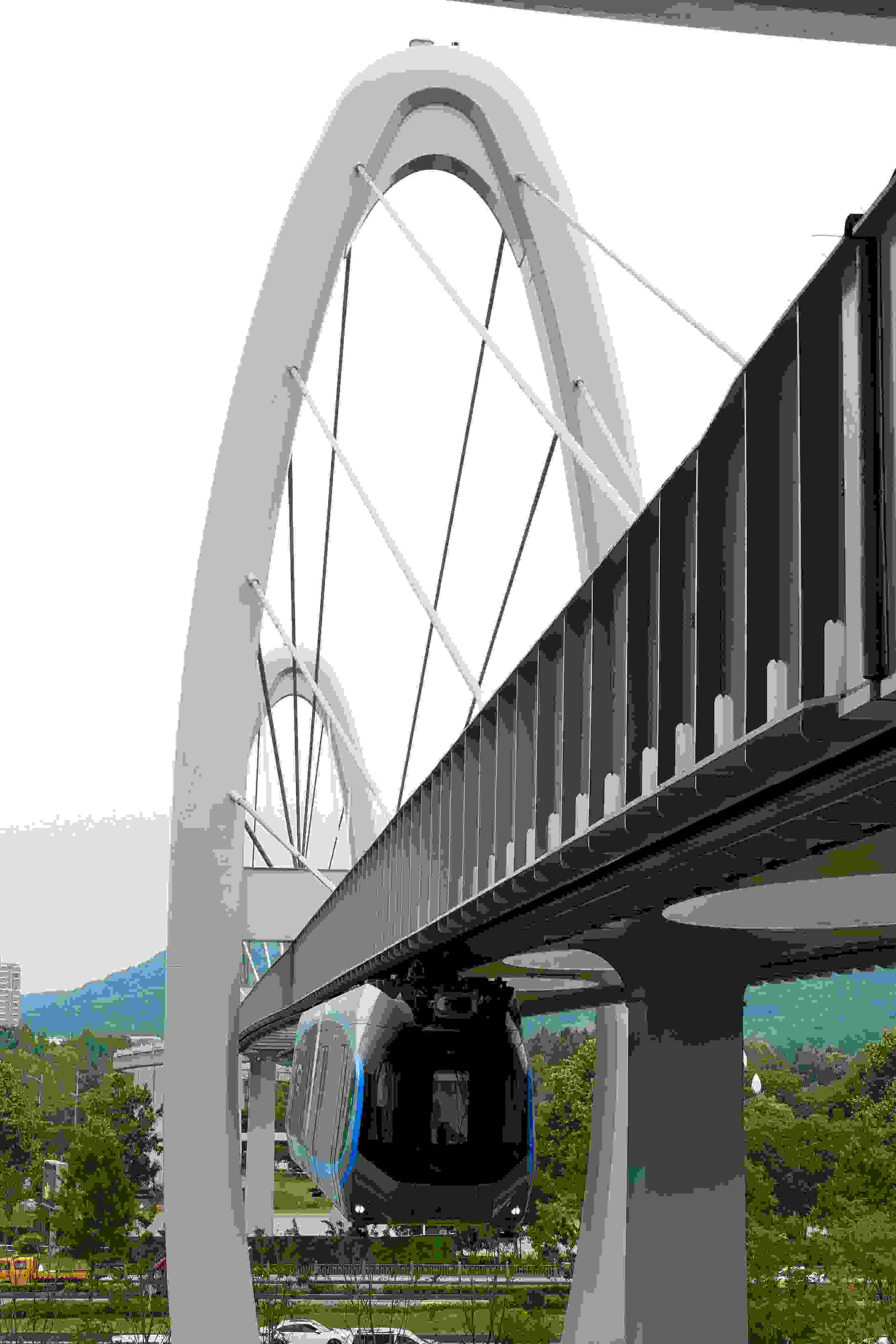 2023年5月11日,武漢,光谷空軌旅游線項(xiàng)目“光谷光子號(hào)”空中軌道列車在東湖高新區(qū)試跑。武漢光谷空軌旅游線項(xiàng)目位于武漢市東湖高新區(qū)光谷中央生態(tài)大走廊內(nèi),是生態(tài)大走廊旅游配套基礎(chǔ)設(shè)施之一。其規(guī)劃總長(zhǎng)26.7公里,先行建設(shè)的一期工程長(zhǎng)約10.5公里,設(shè)車站6座。 視覺中國(guó)