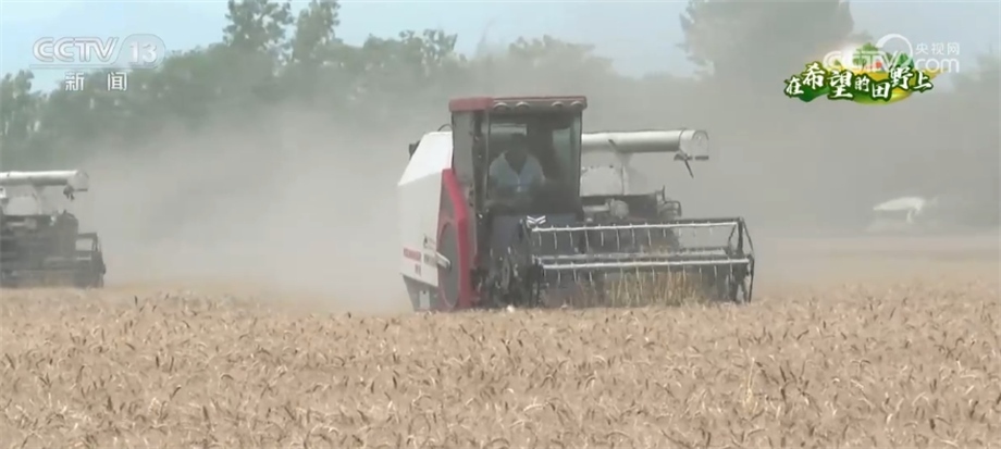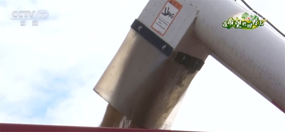總臺記者 趙雄:歡迎大家跟隨我們的鏡頭一起走進成都平原,來感受豐收的喜悅。我現(xiàn)在所在的位置是四川邛崍市的萬畝糧油示范基地。在我身后,200多畝成片的小麥已經(jīng)成熟,放眼望去,金黃的麥穗在風中搖曳,麥浪翻滾煞是喜人。在麥田上,我們可以看到多臺大型收割機來回穿梭作業(yè),一簇簇麥穗被卷入收割機倉,收割、脫粒、除雜一氣呵成,金色麥粒傾瀉入倉。
