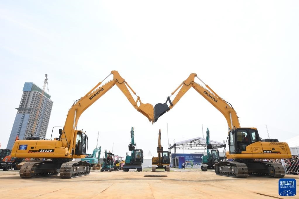 在湖南長沙舉辦的第三屆長沙國際工程機械展覽會上,機手們駕駛挖掘機和裝載機進行整機漂移、“空中漫步”等,并擺出各種造型、秀“舞技”。