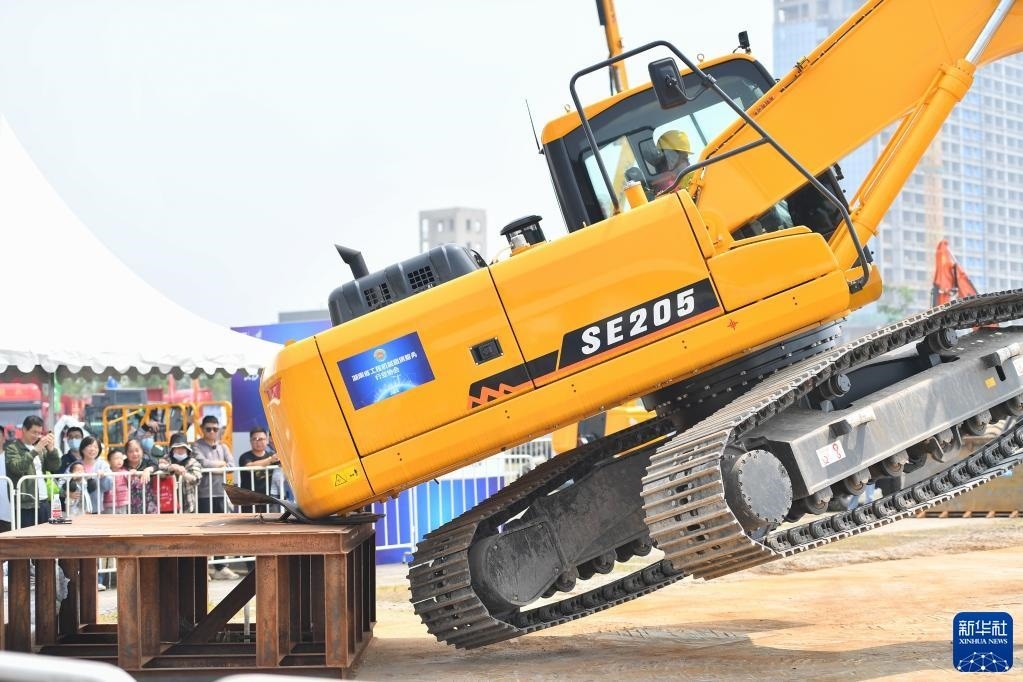 5月13日,在長沙國際工程機械展覽會上,機手駕駛挖掘機表演。