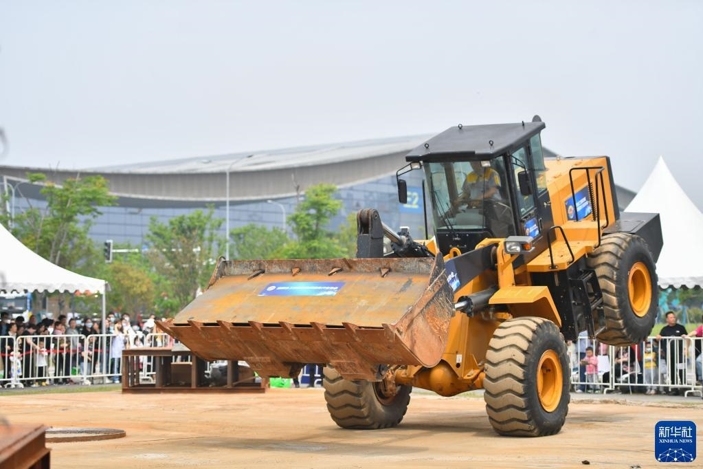 5月13日,在長沙國際工程機械展覽會上,機手駕駛裝載機表演。