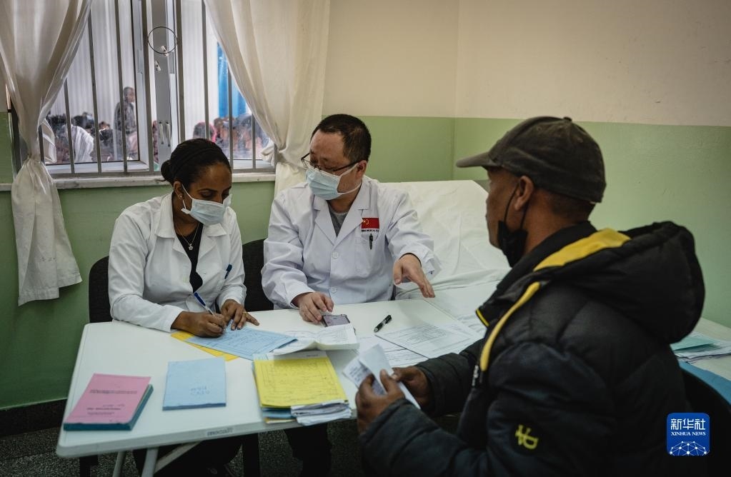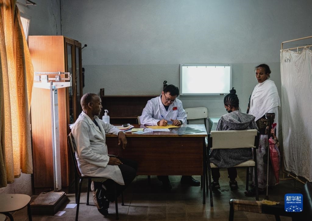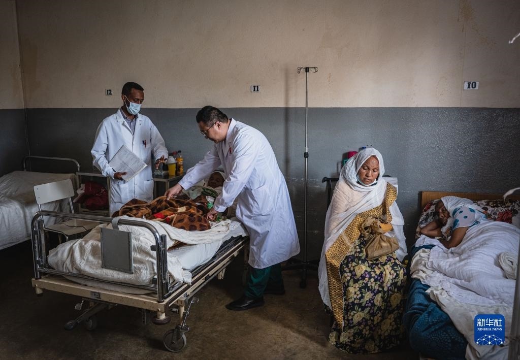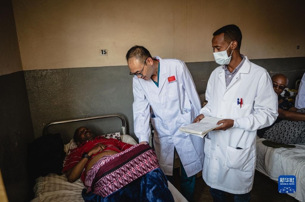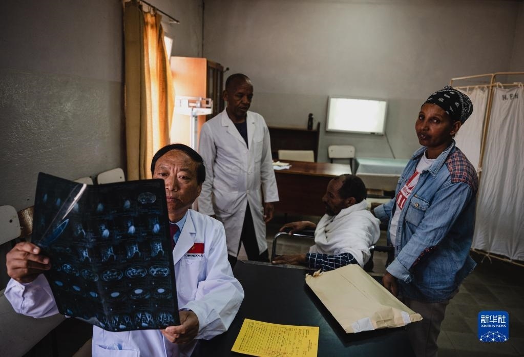 5月9日,在厄立特里亞首都阿斯馬拉的哈利貝特醫(yī)院,醫(yī)療隊脊柱外科醫(yī)生周大凱(中)為患者做檢查。