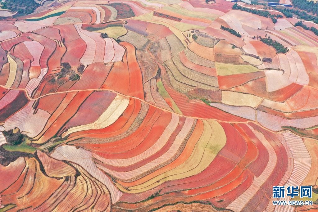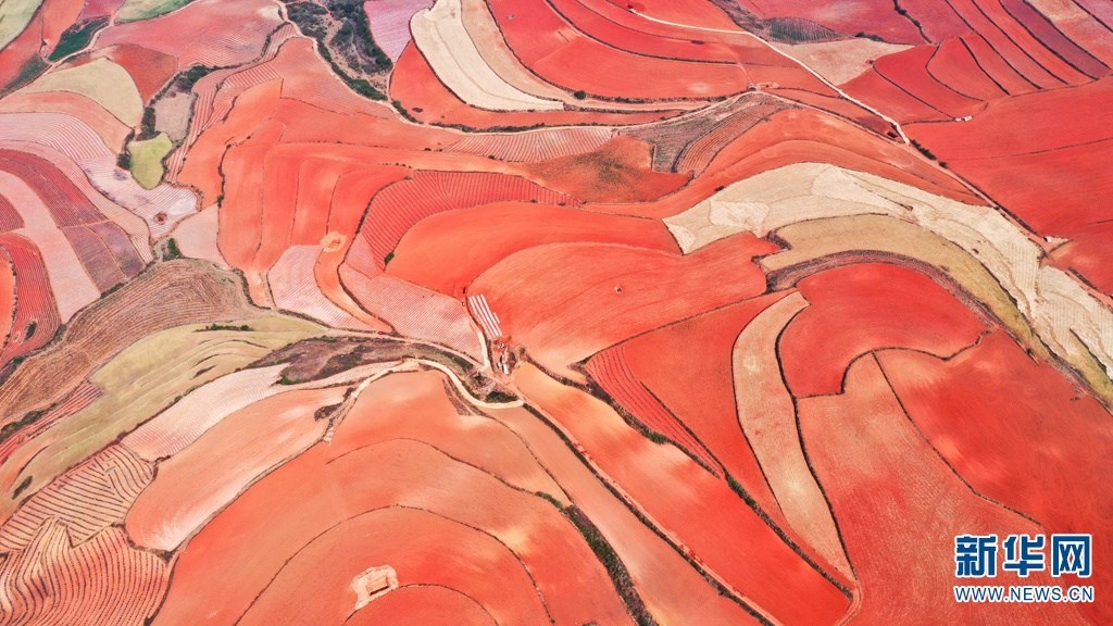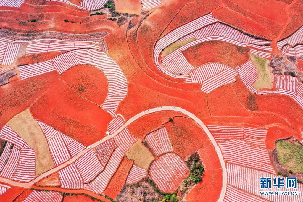 云南省尋甸回族彝族自治縣,連綿不斷的旱梯田遍布山間,遠(yuǎn)接天邊,每年4-5月,經(jīng)過村民翻新、平整后的紅褐色土地,從空中俯瞰五彩斑斕、蔚為壯觀。當(dāng)?shù)卮迕裥燎诟旁诜饰值募t土地上,用勤勞的雙手,繪就一幅幅勞動藝術(shù)畫作。新華網(wǎng)發(fā)(孫文來 攝影報(bào)道)