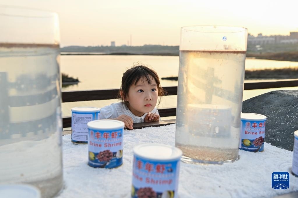5月16日,小朋友在運(yùn)城鹽湖觀察展出的鹵蟲。