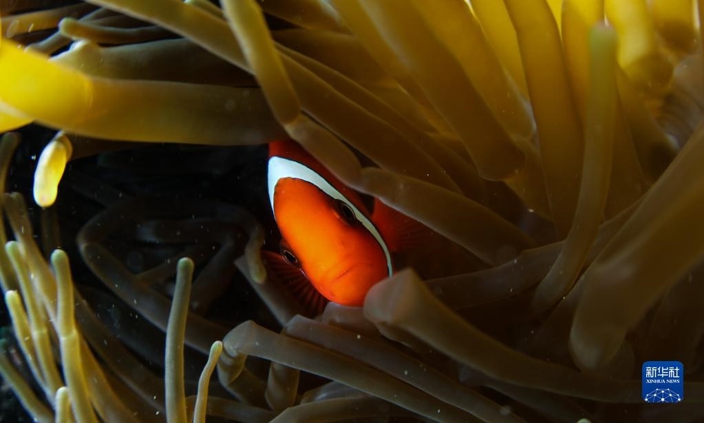 這是在蜈支洲島海域海洋牧場拍攝的藏在海葵中的小丑魚(2021年5月23日攝)。
