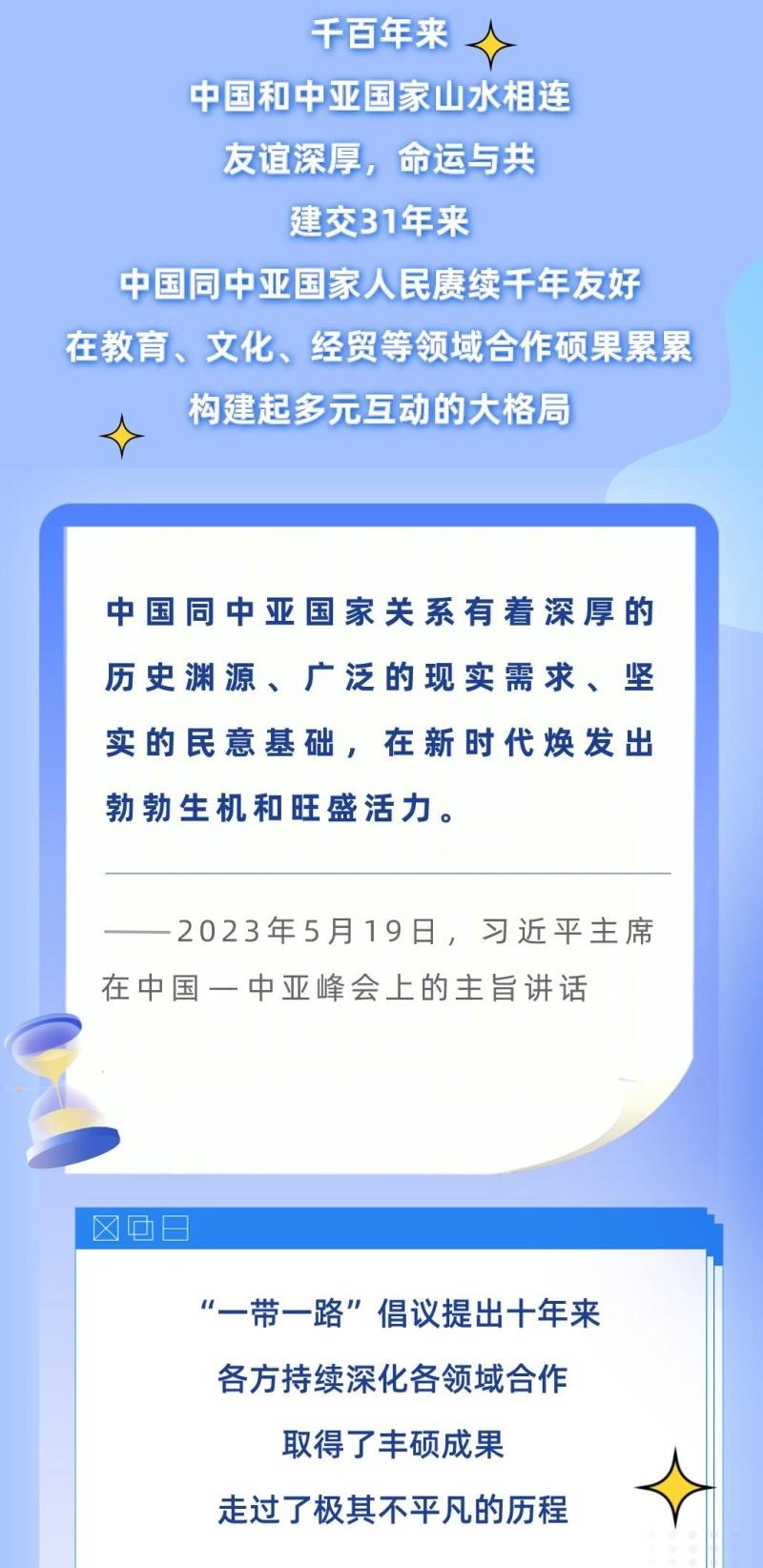 從去年1月的建交30周年視頻峰會(huì),到今年這次中國(guó)—中亞峰會(huì),習(xí)近平主席同中亞五國(guó)元首連續(xù)兩年集體會(huì)晤,并正式成立中國(guó)—中亞元首會(huì)晤機(jī)制,為中國(guó)—中亞關(guān)系發(fā)展作出戰(zhàn)略領(lǐng)航。下面,讓我們一起通過習(xí)近平主席的重要講話,回顧中國(guó)與中亞國(guó)家源遠(yuǎn)流長(zhǎng)的友誼、極其不凡的合作歷程,讀懂中國(guó)—中亞峰會(huì)的重要意義。