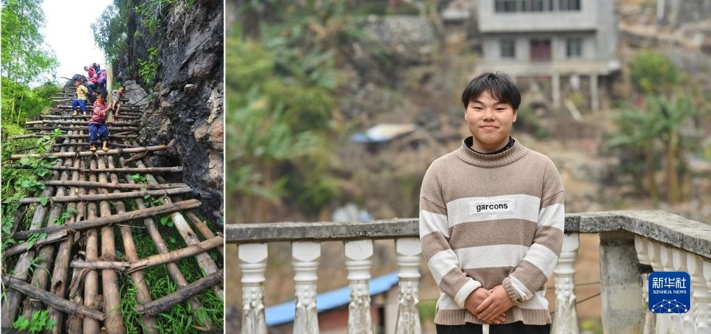 拼版照片:左圖為2012年9月3日,在大化瑤族自治縣板升鄉(xiāng)弄勇村,7歲的藍(lán)天德(右一)攀爬“天梯”去學(xué)校;右圖為2023年1月23日,在大化瑤族自治縣板升鄉(xiāng)弄勇村,即將從技校畢業(yè)的藍(lán)天德回家過年。18歲的藍(lán)天德計(jì)劃技校畢業(yè)后繼續(xù)讀大專。 新華社記者 黃孝邦 攝