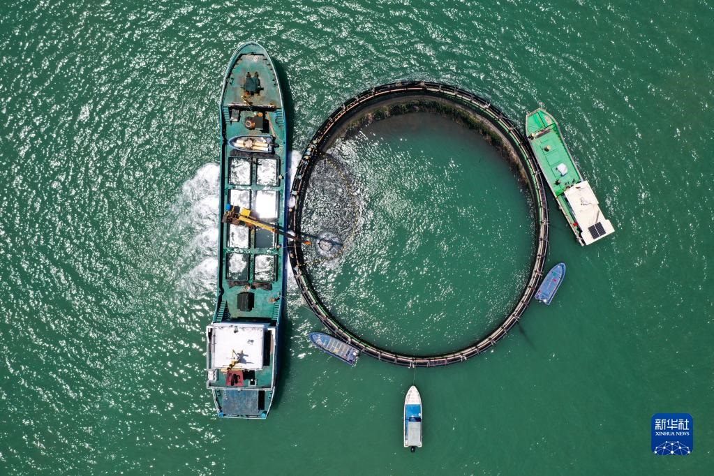 5月27日,在湛江市徐聞縣西連鎮(zhèn),漁業(yè)工人從徐聞國(guó)橋深海養(yǎng)殖有限公司的金鯧魚深海網(wǎng)箱捕魚(無人機(jī)照片)。