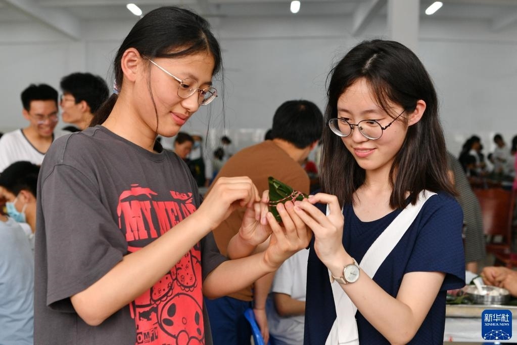 5月28日,在江蘇省常州市北郊高級中學(xué),高三學(xué)生在包粽子。   新華社發(fā)(史康攝)