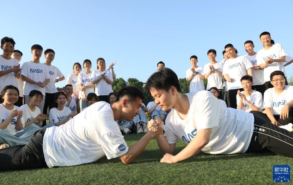 5月29日,在湖南省衡陽市衡陽縣第一中學(xué)操場,高三畢業(yè)班同學(xué)在晨練中比賽扳手腕。   新華社發(fā)(曹正平攝)