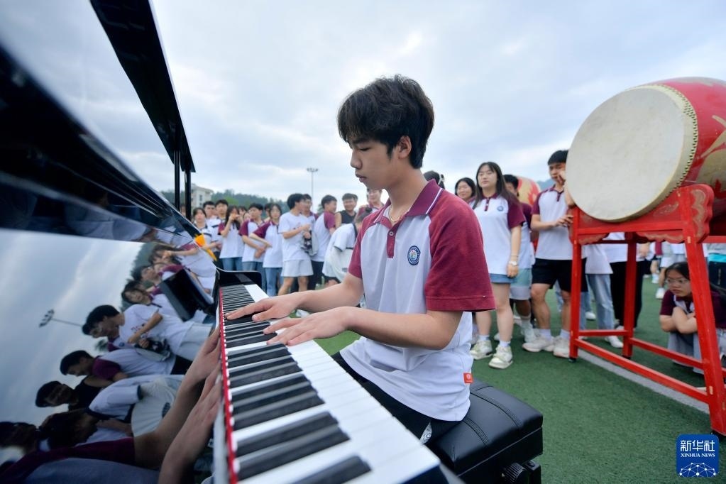 5月29日,在湖北省宣恩縣第一高級中學(xué)的快閃活動現(xiàn)場,學(xué)生在彈奏鋼琴。   新華社發(fā)(宋文攝)