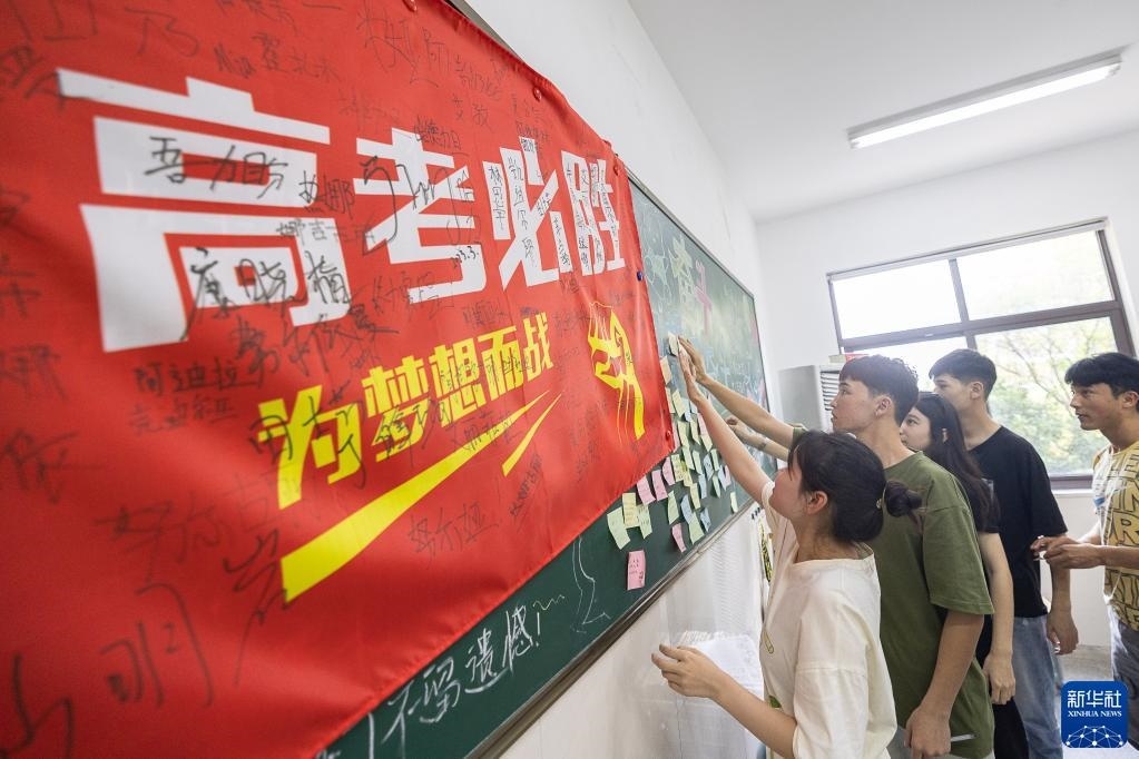 5月28日,在浙江省湖州市長興縣職業(yè)技術(shù)教育中心學(xué)校,高三學(xué)生在黑板上粘貼高考寄語。   新華社發(fā)(伊凡攝)