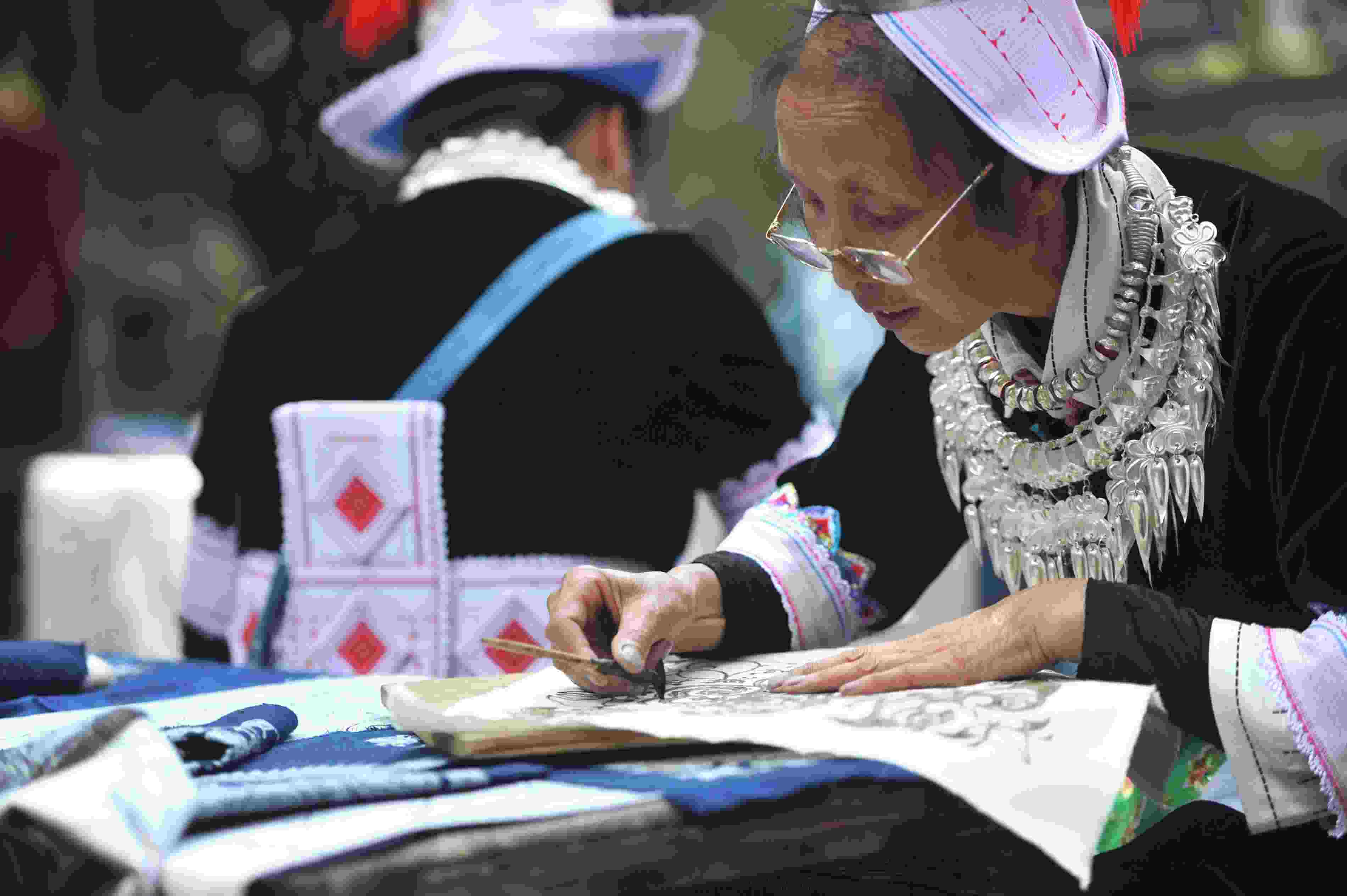 2023年5月26日,民間藝人在貴州省黃平縣飛云崖景區(qū)展示傳統(tǒng)蠟染技藝。 (寧堅(jiān) 楊忠)