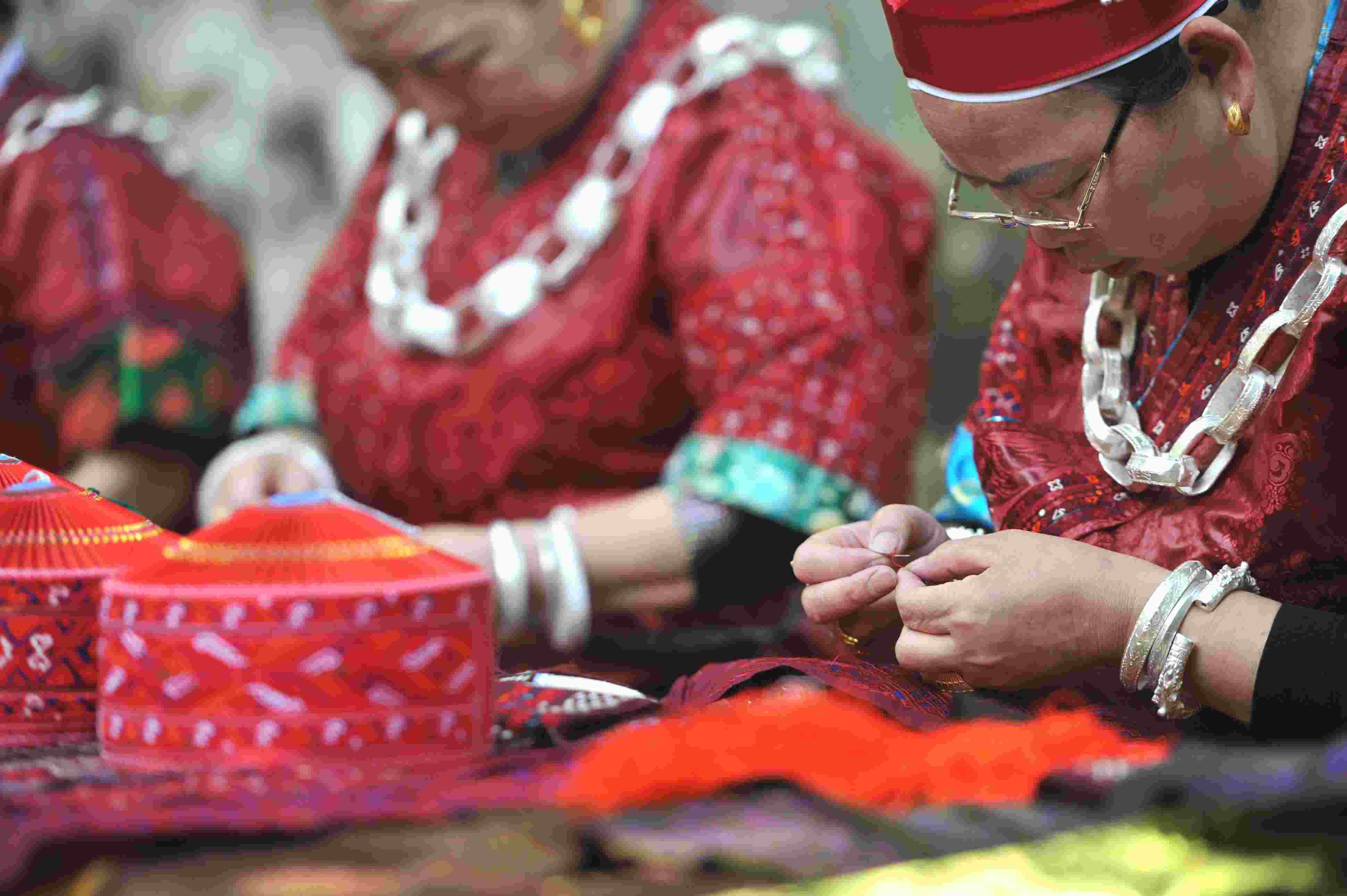 2023年5月26日,民間藝人在貴州省黃平縣飛云崖景區(qū)展示傳統(tǒng)刺繡技藝。 (寧堅(jiān) 楊忠)