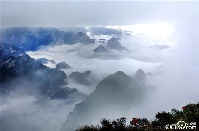 2023年5月26日,陜西渭南,西岳華山云霧繚繞,山峰若隱若現。