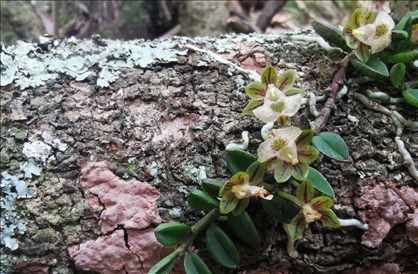 蘭科新物種——臥龍無柱蘭,于2021年11月發(fā)表于國際植物學(xué)期刊《北歐植物學(xué)》,是程躍紅和林紅強(qiáng)等人在轄區(qū)巡護(hù)監(jiān)測過程中發(fā)現(xiàn)的,以模式產(chǎn)地“臥龍”命名。該蘭科植物生長在海拔2700米左右的陡峭崖壁上,植株高約19-22厘米,花期7-8月,莖為呈紫紅色,開白色小花,中心為綠色,目前僅在大熊貓國家公園臥龍片區(qū)發(fā)現(xiàn)1個(gè)居群,約70株成熟個(gè)體,參照IUCN(世界自然保護(hù)聯(lián)盟)的標(biāo)準(zhǔn),臥龍無柱蘭被認(rèn)定為“極度瀕危”等級的植物。