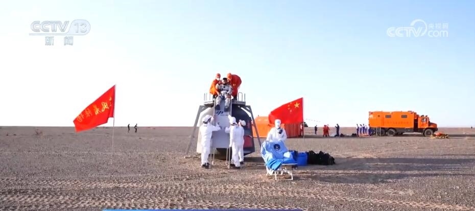總臺記者 郭靜:在返回艙降落后處于直立狀態(tài)時,我旁邊的這個操作平臺就發(fā)揮了大作用,它采用鎂鋁合金材質(zhì),相較之前更加輕便了,處置隊員從飛機降落后到搭建好操作平臺也就需要5分鐘左右的時間。除了輕便以外呢,它的滑梯坡度也更加平緩了,航天員下滑時也會更加舒適。