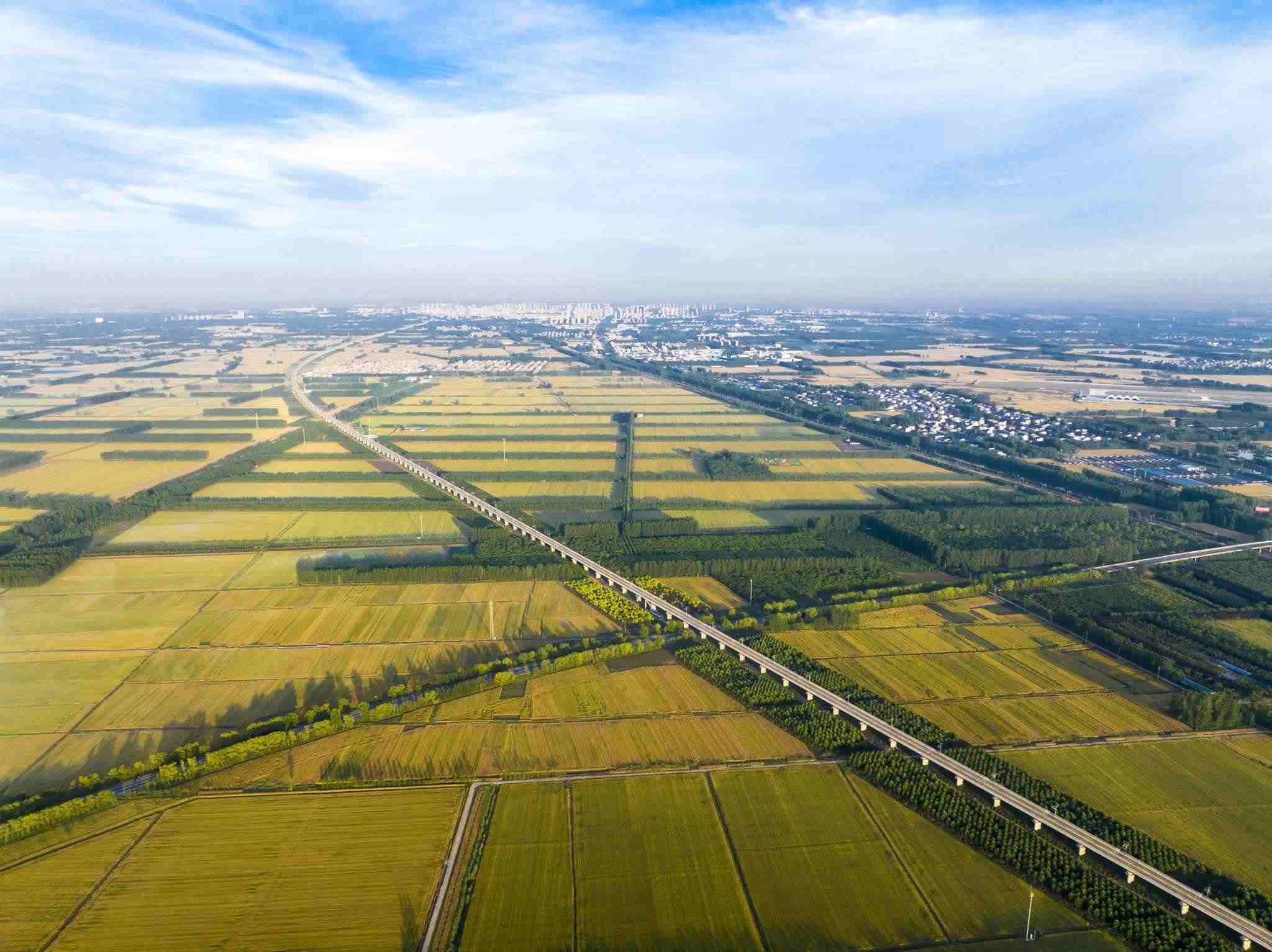 2023年6月3日,江蘇連云港,東??h,金色田野與村莊、道路、河流共同構(gòu)成了一幅秀美的夏日豐收畫卷。視覺中國