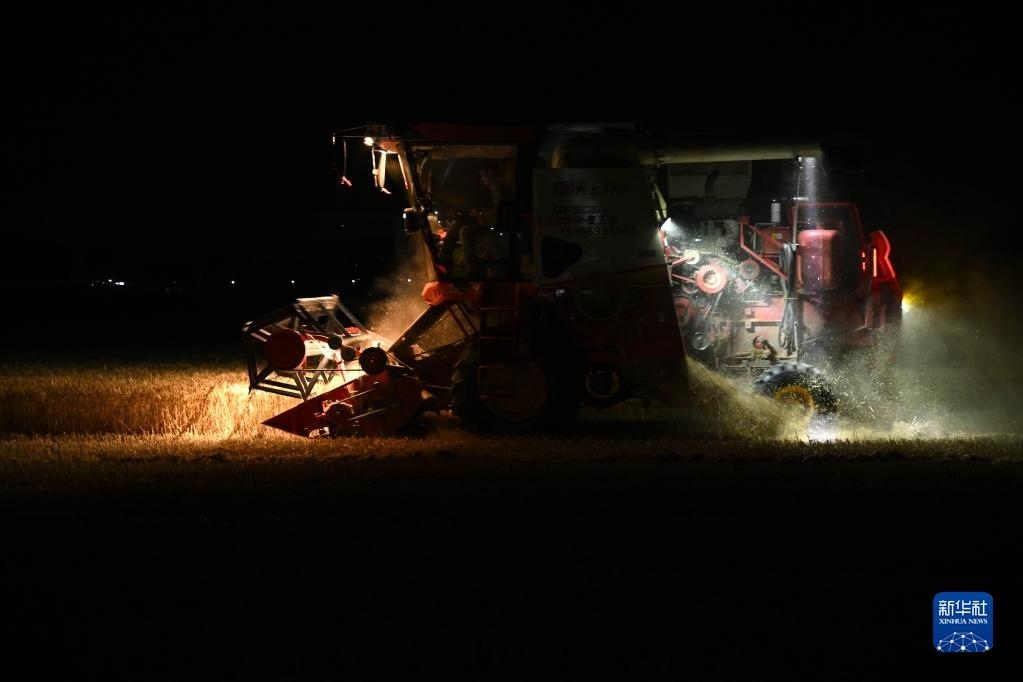 6月2日夜晚,在阜陽市阜南縣苗集鎮(zhèn)的一處麥田,農(nóng)機手駕駛收割機收割小麥。