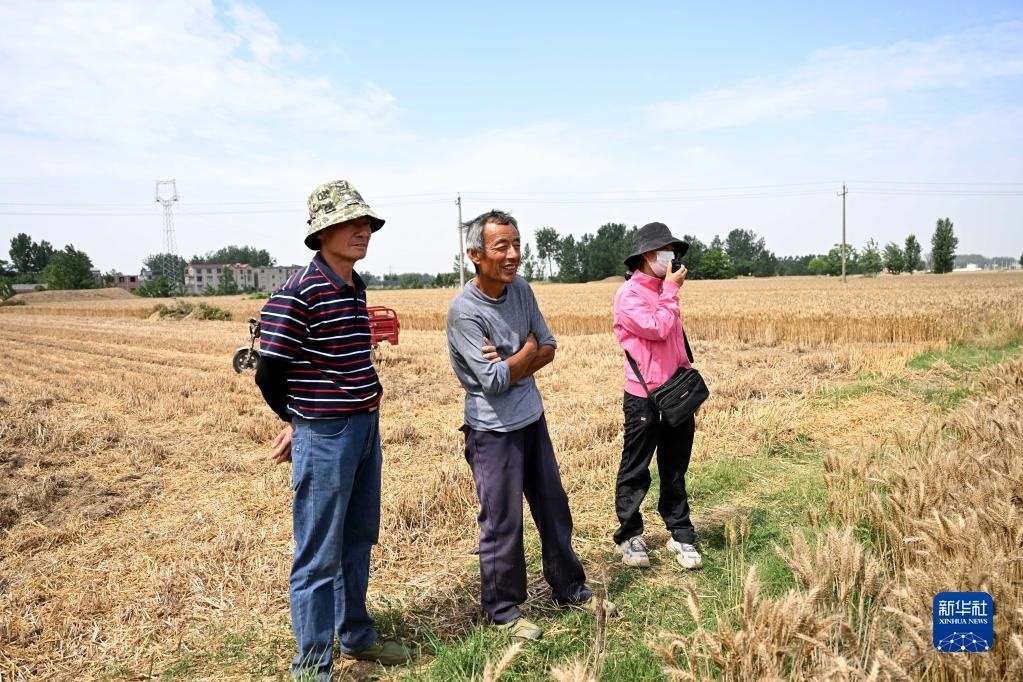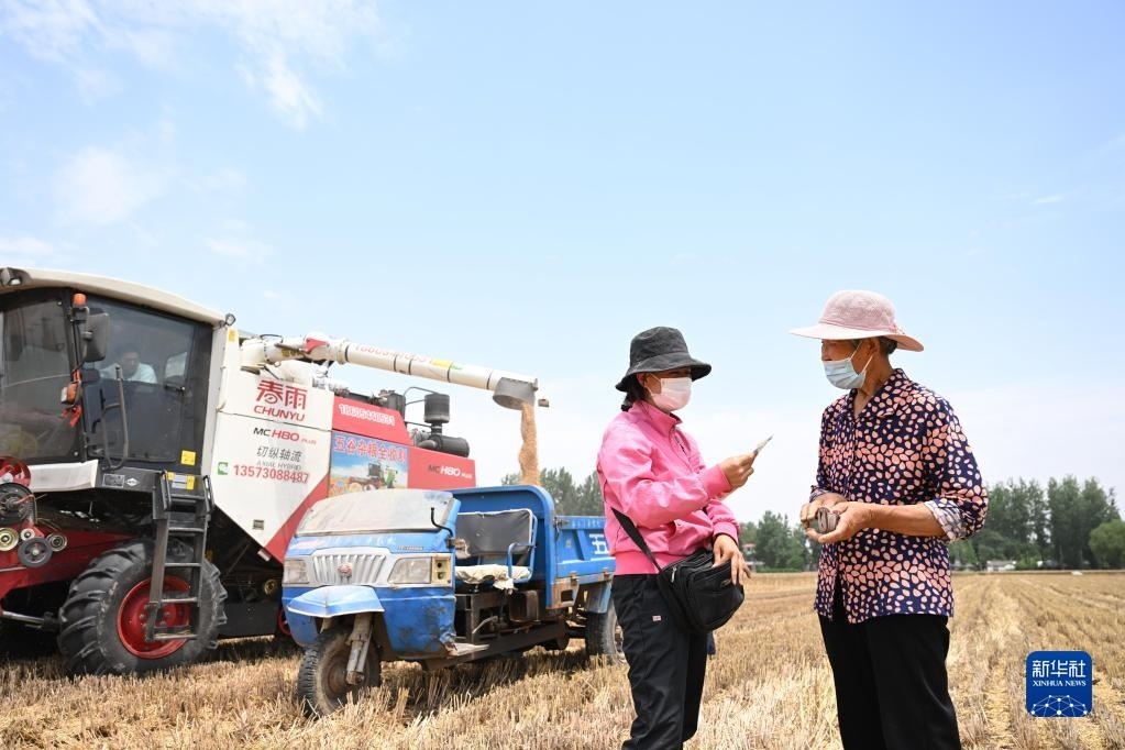 6月2日,在安徽省阜陽市阜南縣許堂鄉(xiāng)劉崗村,陳麗娟和村民確認(rèn)收割費(fèi)用。
