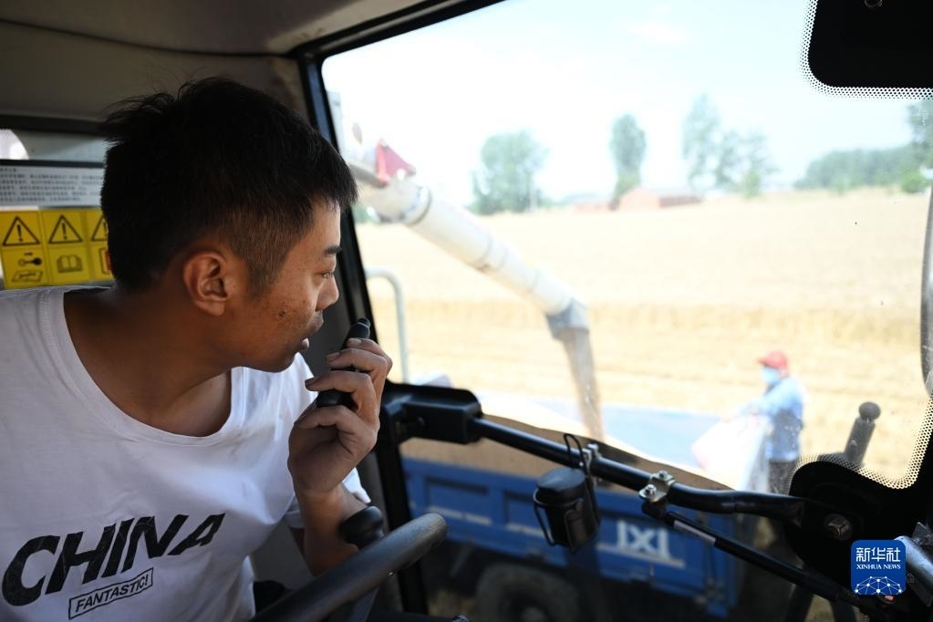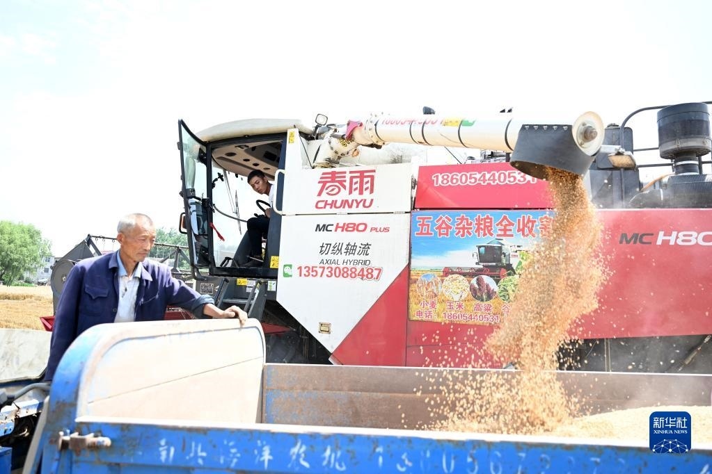 6月2日,在安徽省阜陽市阜南縣許堂鄉(xiāng)劉崗村,董斐斐駕駛收割機(jī)將收割的小麥裝車。