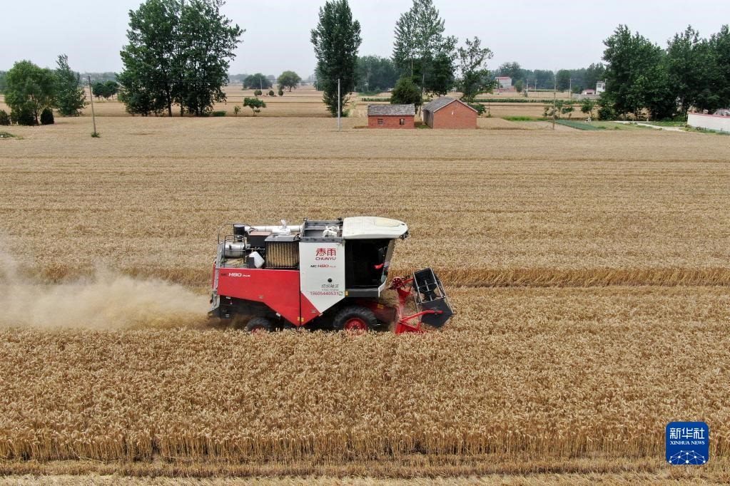 6月2日,在安徽省阜陽市阜南縣許堂鄉(xiāng)劉崗村,董斐斐駕駛收割機(jī)為村民收割小麥(無人機(jī)照片)。