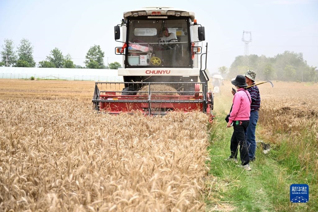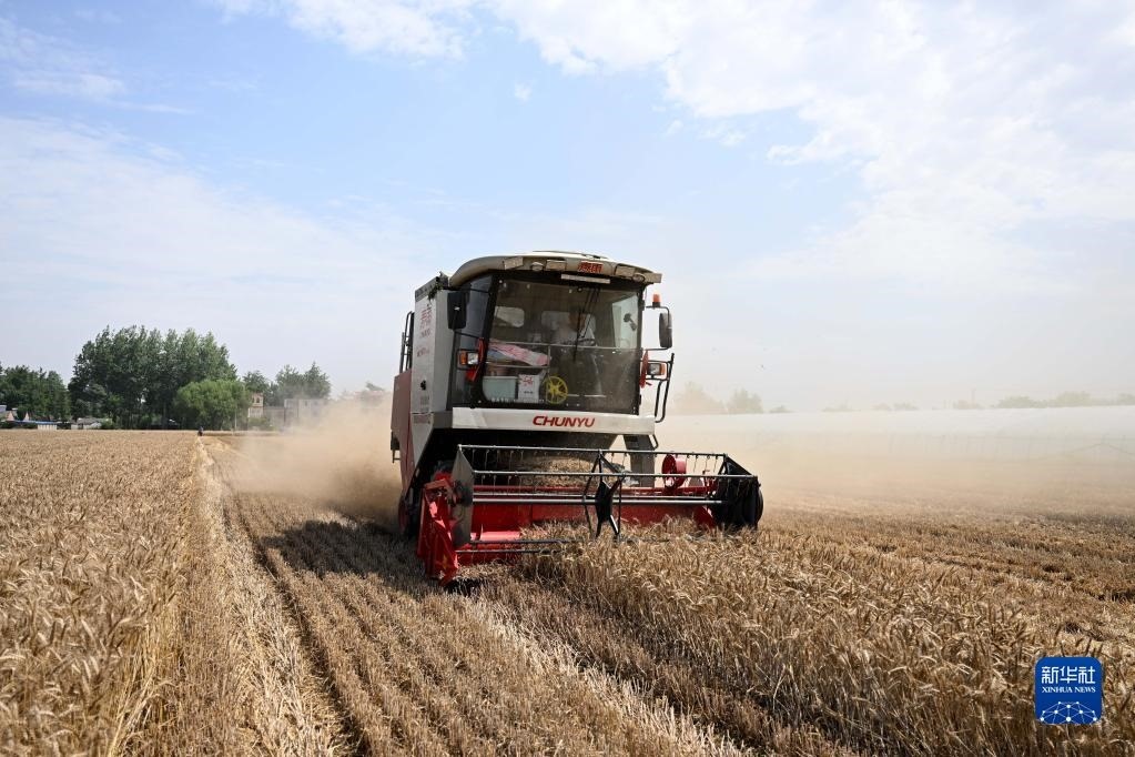 6月2日,在安徽省阜陽市阜南縣許堂鄉(xiāng)劉崗村,董斐斐駕駛收割機(jī)為村民收割小麥。