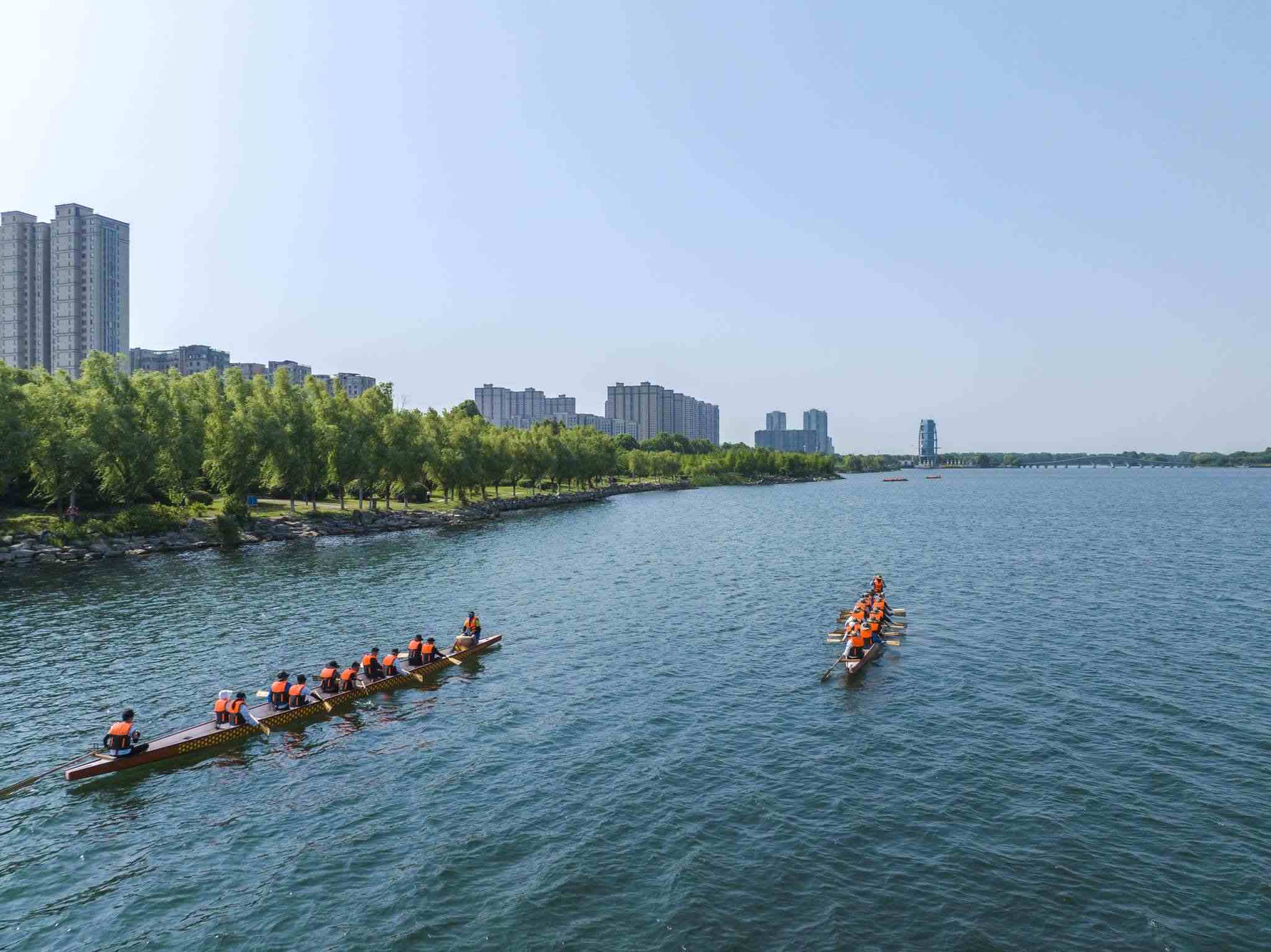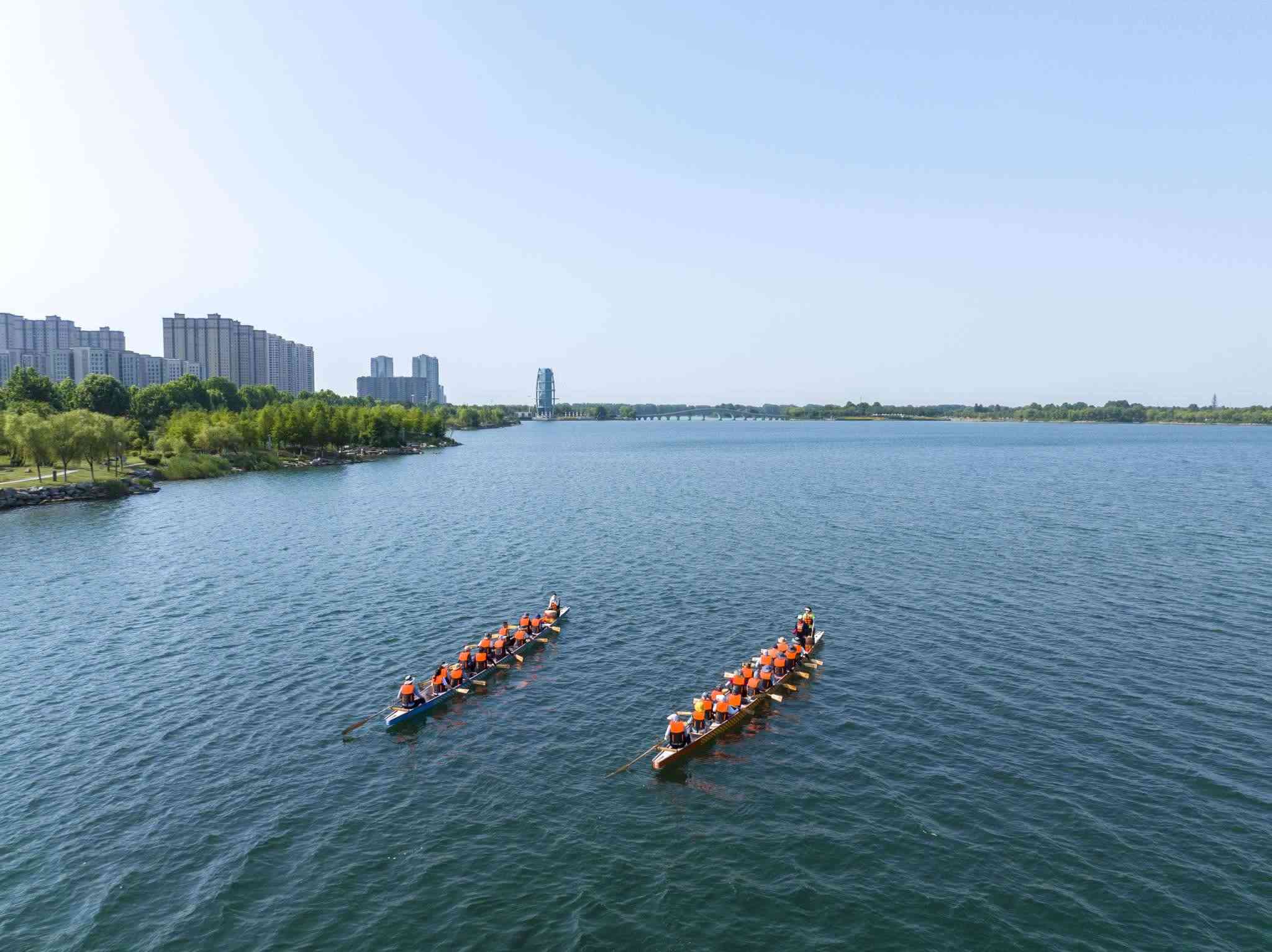2023年6月8日,江蘇連云港,東海縣西雙湖風(fēng)景區(qū),多支龍舟隊(duì)在西雙湖水域進(jìn)行訓(xùn)練,積極備戰(zhàn)端午龍舟賽。視覺中國