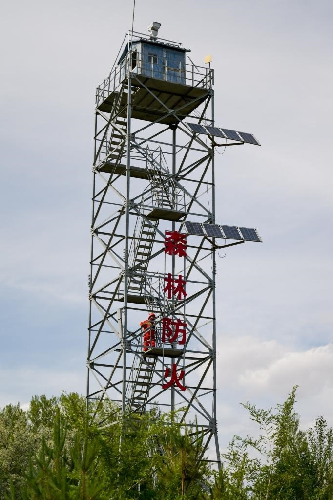 6月5日,臨河區(qū)國營新華林場護林員登上瞭望塔準備開展巡護工作。新華社記者 李志鵬 攝