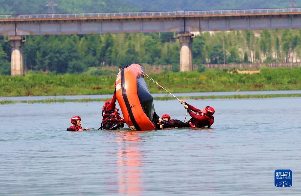當(dāng)日,在浙江省湖州市長(zhǎng)興縣合溪水庫(kù)煤山段,煤山鎮(zhèn)組織黨員干部、應(yīng)急管理隊(duì)員、志愿者組成應(yīng)急救援隊(duì),開(kāi)展防汛減災(zāi)應(yīng)急綜合實(shí)戰(zhàn)演練,通過(guò)沖鋒舟編隊(duì)、水上打撈、水上救援等課目訓(xùn)練,增強(qiáng)防汛應(yīng)急處置和水上搶險(xiǎn)救災(zāi)能力。新華社發(fā)(許旭 攝)