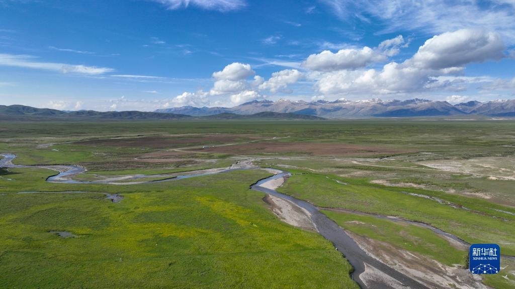 夏日,青海省南部的高原草原一碧千里,與雪山、白云相映成趣,景色宜人。   新華社記者 張龍 攝