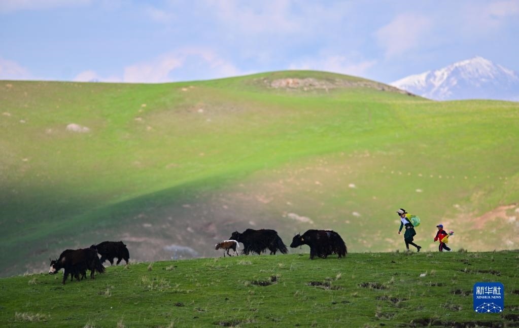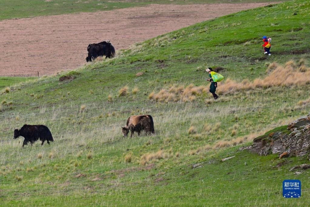 6月9日,在青海省黃南藏族自治州澤庫縣的高原草原上,當?shù)啬撩裨诜拍痢?  新華社記者 張龍 攝
