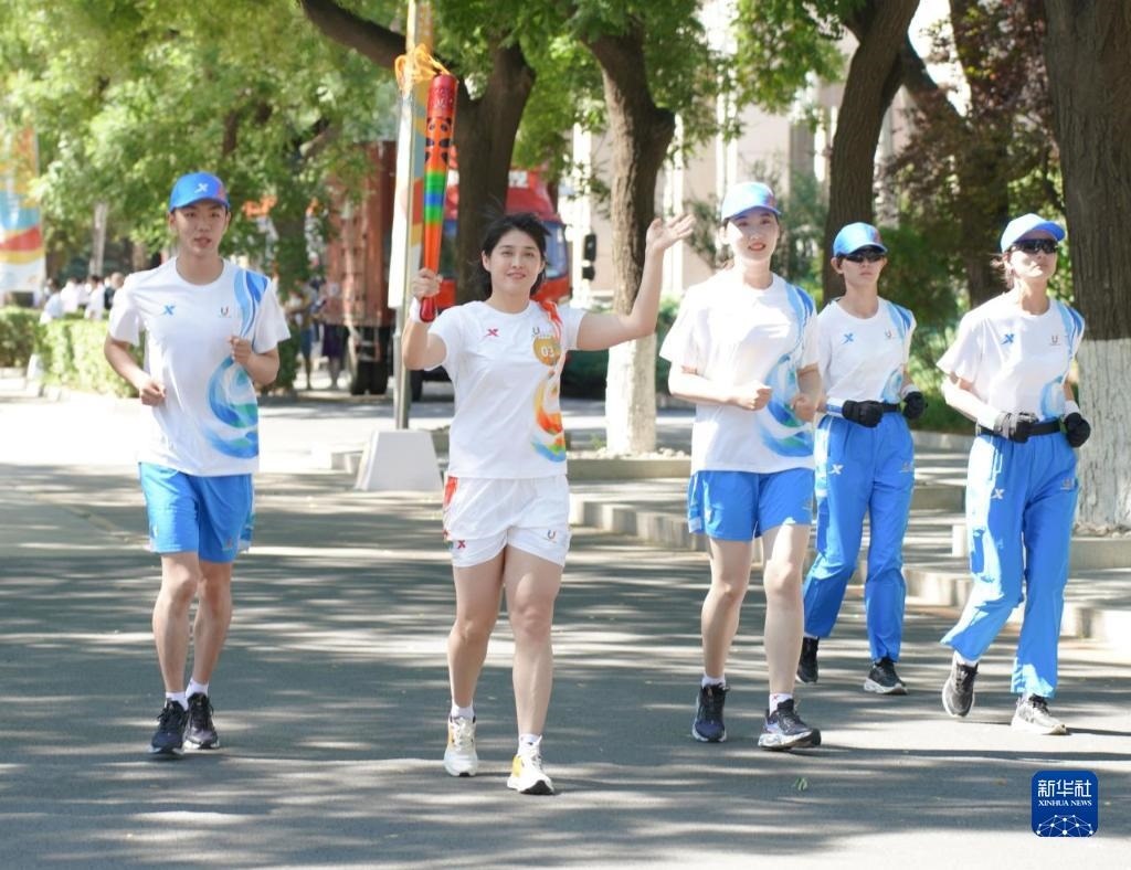 6月10日,火炬手丁寧(中)在火炬?zhèn)鬟f中。