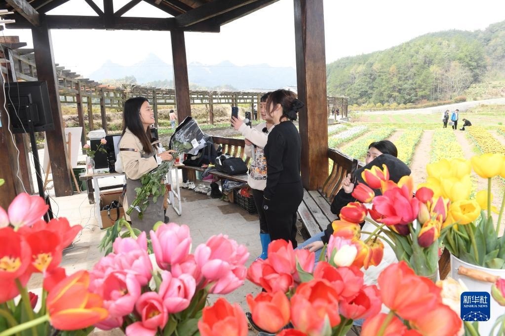 主播在浙江金華浦江縣杭坪鎮(zhèn)烏漿村的花海間直播賣(mài)花(3月28日攝)。新華社記者 翁忻旸 攝
