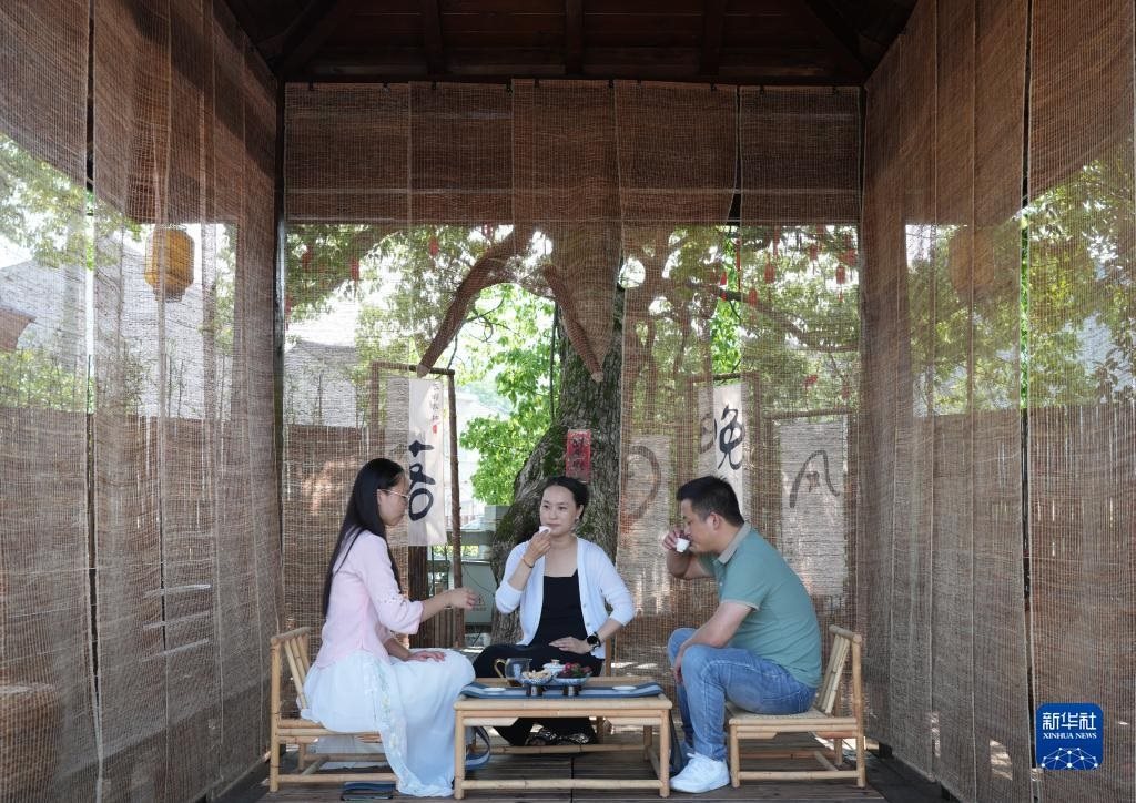 人們?cè)谡憬_(tái)州黃巖區(qū)嶼頭鄉(xiāng)布袋坑村的溪水旁喝茶(5月30日攝)。近年來(lái),嶼頭鄉(xiāng)堅(jiān)持黨建引領(lǐng),以全域旅游和美麗鄉(xiāng)村建設(shè)為重要抓手,引進(jìn)文化創(chuàng)意團(tuán)隊(duì),為鄉(xiāng)村旅游注入更加年輕化的元素,推進(jìn)特色民宿以及布袋山饅頭、溪坑魚(yú)等農(nóng)特產(chǎn)品的發(fā)展,帶動(dòng)鄉(xiāng)村振興和百姓共富。新華社記者 徐昱 攝